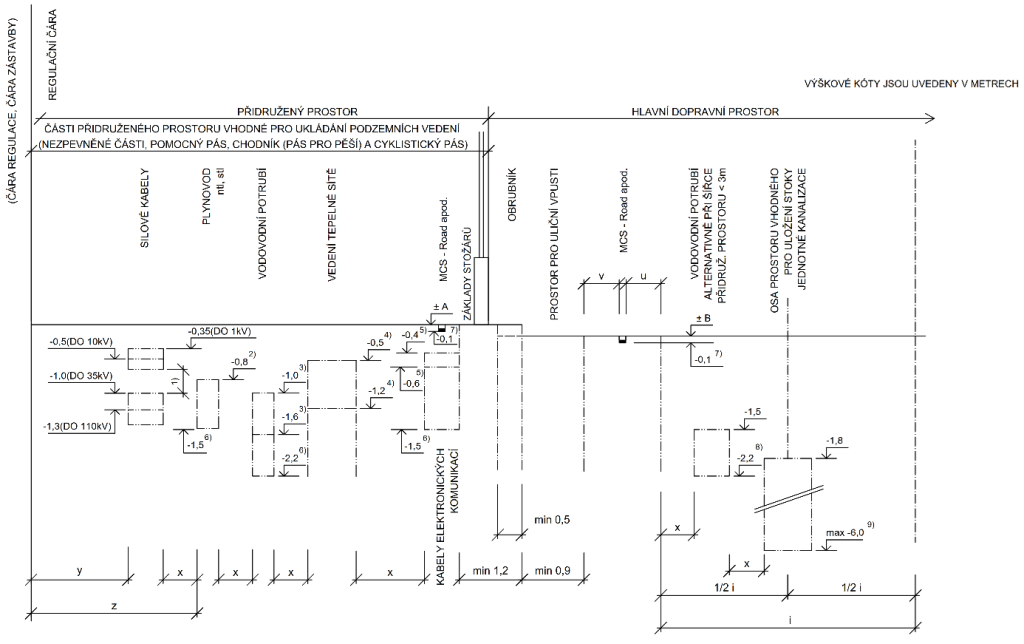 Obrázek č. 1 – Zájmová pásma jednotlivých druhů vedení technického vybavení v podzemní trase a jejich posloupnost v přidruženém prostoru místní komunikace a v hlavním dopravním prostoru společně se stokou jednotné kanalizace